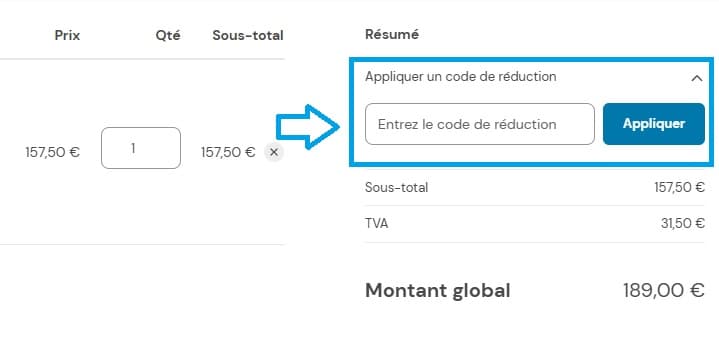 - Puis, accédez à la page de récapitulatif de la commande et recherchez le champ intitulé “Appliquer un code de réduction”.