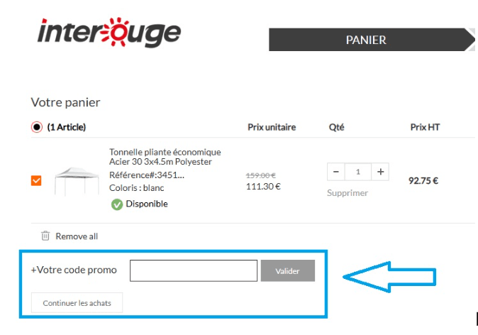 - Commencez par vous assurer que votre code promotionnel Interouge est actif et applicable sur les produits que vous souhaitez commander. Certains codes peuvent être soumis à des conditions comme un montant minimum d’achat ou être limitées à une sélection précise de structures événementielles ou d’accessoires.