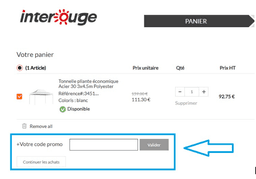 - Au moment de valider votre commande, recherchez l’espace dédié au code de réduction. Saisissez-y votre code promo Interouge, puis validez l’opération.