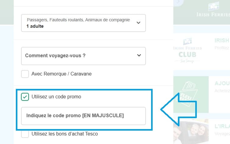 - Saisissez votre code promo Irish Ferries dans ce champ et validez-le pour appliquer la remise.