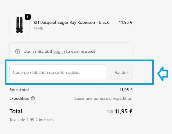 - Repérez la zone “Code de réduction ou carte-cadeau”, saisissez votre code promo Jimmy Lion et appliquez-le à votre panier.