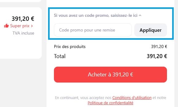 - Lors de la finalisation de votre commande, accédez à votre panier et localisez le champ nommé : “Si vous avez un code promo, saisissez-le ici”