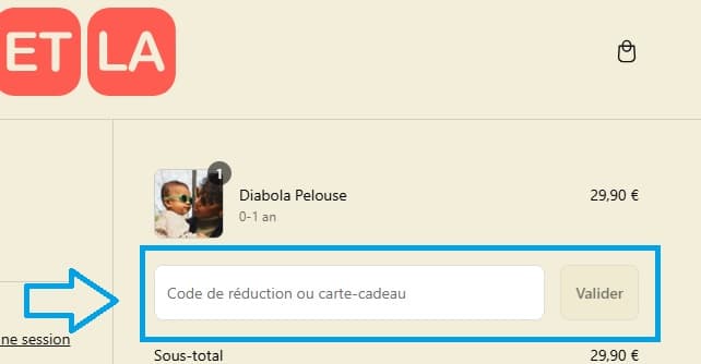 - Sur la page de commande, repérez le champ ”Carte cadeau ou code de réduction”. Entrez-y votre code promo KI ET LA.