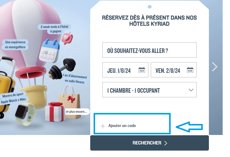 - Avant de lancer la recherche, placez votre curseur sur le lien "Ajouter un code". Cliquez dessus pour faire apparaître la case réservée au code promo Kyriad. Entrez votre code de réduction Kyriad dans cette case et continuez le processus de réservation.