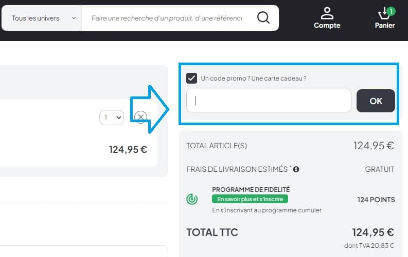 - Ensuite, localisez le champ nommé : “Un code promo ? Une carte cadeau ?” et insérez votre code promotionnel La Bécanerie dans cet encart.