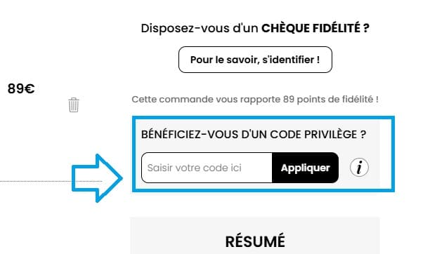 - Puis, repérez l’encart dédié aux codes promotionnels nommé “Bénéficiez-vous d'un code privilège ?.” Entrez-y votre code réduction La Femme Moderne, puis validez. La remise s’applique automatiquement sur le montant total.