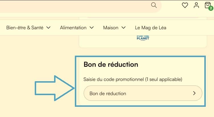 - Avant de régler votre achat, entrez votre code promo Léa Nature dans le champ “Bon de réduction”et appliquez-le à votre commande.