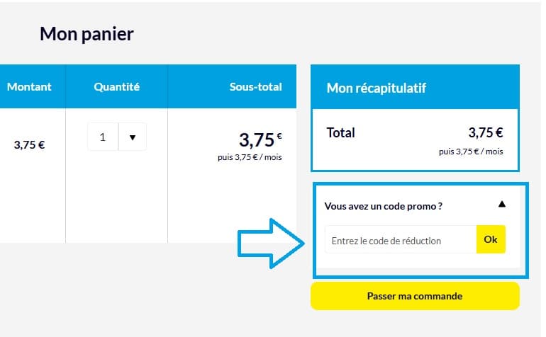- Ensuite, repérez la case « Vous avez un code promo ? ». Insérez-y le code promo Bayard que vous avez trouvé.