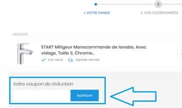 - Une fois vos produits sanitaires, équipements maison ou jardin sélectionnés, cliquez sur "Commander" pour accéder à votre panier. Vous y trouverez un champ nommé "Votre coupon de réduction".
