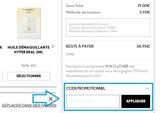- Avant de finaliser votre commande, cherchez le champ intitulé “Code promotionnel” et saisissez votre code promo Mac Cosmetics dans cet espace.
