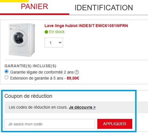 - Puis, repérez l’espace “Coupon de réduction” et mettez dans cette case votre code promo MDA électroménager .