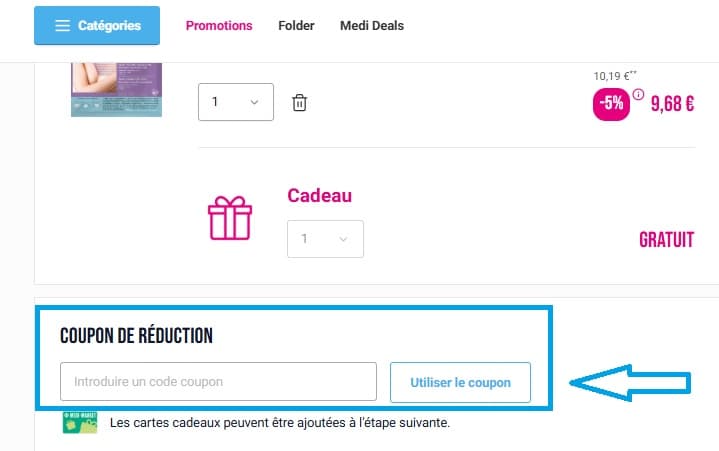 - Appliquer votre code avantage : Lors de la validation de votre panier, saisissez votre code promo Medi-Market dans le champ “Coupon de réduction” et cliquez sur “Utiliser le coupon”. La remise est immédiatement appliquée, réduisant ainsi le montant total de votre commande.
