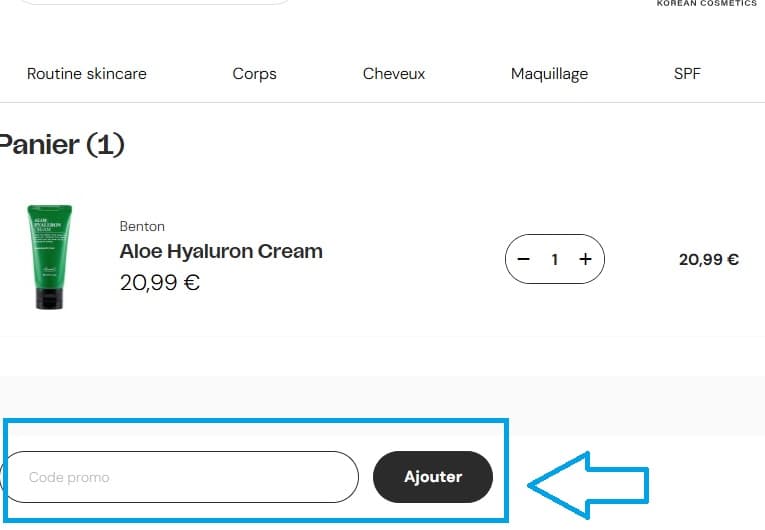 - Saisissez votre code de réduction MiiN Korean Cosmetics dans le champ “Code promo”.