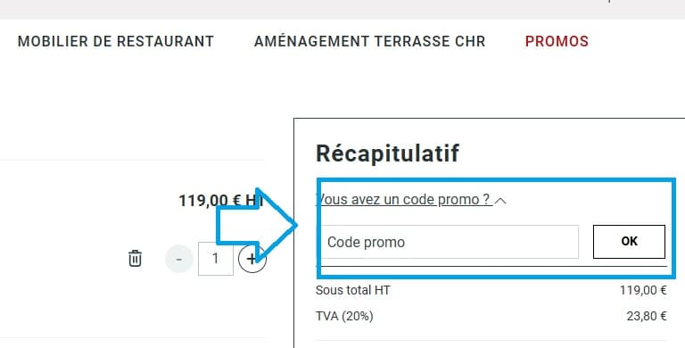 - Dans le récapitulatif de votre commande, localisez le champ "Vous avez un code promo ? ". Entrez-y le code de réduction MobEventPro que vous avez choisi et cliquez sur "OK" et la remise sera immédiatement appliquée au montant total de votre commande.