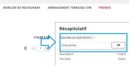 - Dans le récapitulatif de votre commande, localisez le champ "Vous avez un code promo ? ". Entrez-y le code de réduction MobEventPro que vous avez choisi et cliquez sur "OK" et la remise sera immédiatement appliquée au montant total de votre commande.