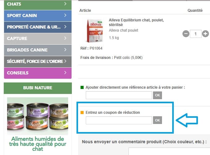 - Appliquez votre code et vérifiez la réduction : insérez votre code promo Morin dans la case prévue et cliquez sur “OK”. Assurez-vous que la remise est bien appliquée sur vos accessoires pour chiens, alimentation pour chats, ou autres produits pour le sport canin, avant de finaliser votre paiement sécurisé.