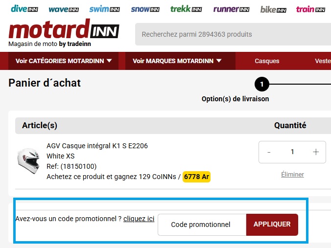 - Il faut d’abord sélectionner un code de réduction Motardinn correspondant aux produits souhaités.