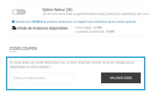 - Une fois que vous avez sélectionné vos produits, rendez-vous sur la page de votre panier. Vous y trouverez une case nommée “Codes coupon” et entrez votre code promo Moto Axxe.