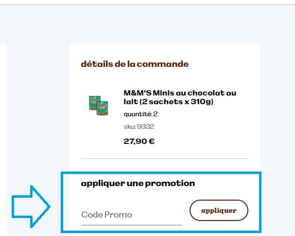 - Dans la page de paiement, repérez le champ “Appliquez une promotion" et entrez votre code promo M&M'S. Cliquez ensuite sur "Ajouter" pour appliquer la réduction à votre commande.