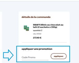 - Dans la page de paiement, repérez le champ “Appliquez une promotion" et entrez votre code promo M&M'S. Cliquez ensuite sur "Ajouter" pour appliquer la réduction à votre commande.
