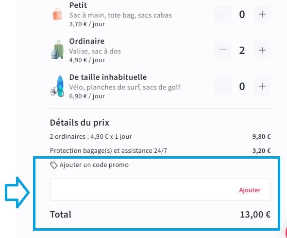 - Sur cette page, vous trouverez un champ nommé “Ajouter un code promo”. Saisissez-y votre code de réduction Nannybag.