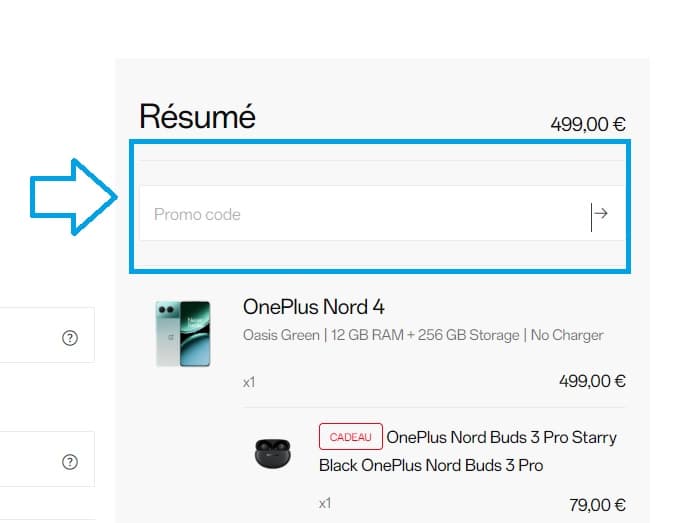 - Sur la page du récapitulatif de votre achat, vous trouvez un champ nommé “Promo code”, mettez votre code promo OnePlus dans cet espace.
