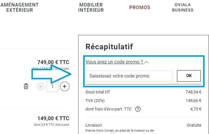 - Sur la page de votre panier, repérez le champ réservé aux codes avantages, nommé “Vous avez un code promo ?” et collez votre code de réduction Oviala.