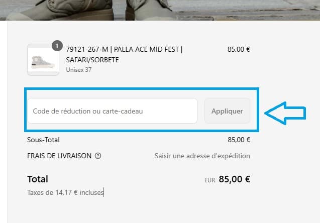 - Vous y trouverez une case dédiée aux codes promo Palladium nommé code de réduction ou carte-cadeau
