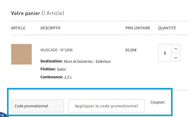 - Lors du passage en caisse, repérez le champ « Code promotionnel » et saisissez votre code avantage Peintures 1825.
