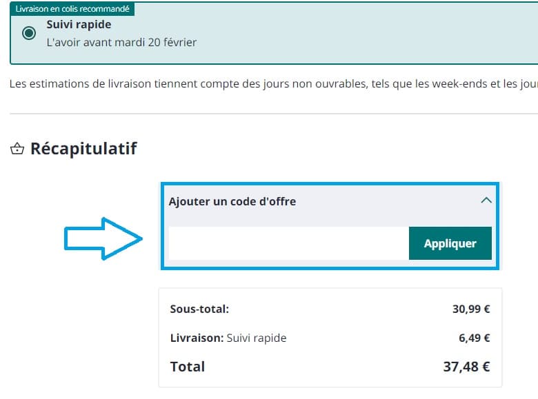 - Mettez votre code promo Photobox dans la case “Ajouter un code d'offre”.