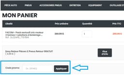 - Sur la page du récapitulatif de votre commande, recherchez le champ intitulé “Code promo”. Saisissez votre code promo Pièces & Pneus dans cet espace et cliquez sur Appliquer pour que la réduction soit prise en compte sur votre commande.