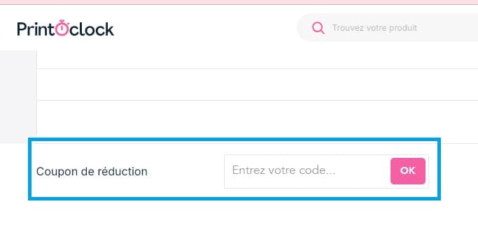 - Ensuite, accédez à votre panier pour finaliser la commande. Avant de procéder au règlement, recherchez la section dédiée aux codes avantages. Entrez votre code promo PrintOclock dans la case intitulée "Coupon de réduction".