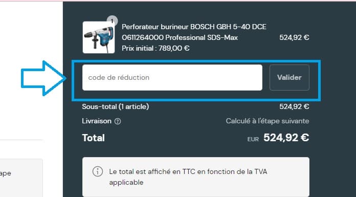 - Sur la page de récapitulatif de votre commande, recherchez le champ intitulé "Code de réduction". C’est dans cette case que vous devez mettre votre code promo Racetools.