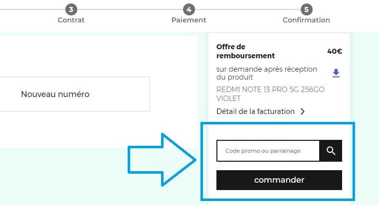 - Sur cette page, recherchez un champ intitulé "code promo ou parrainage". C'est là que vous devrez entrer votre code promo RED by SFR - Téléphones.