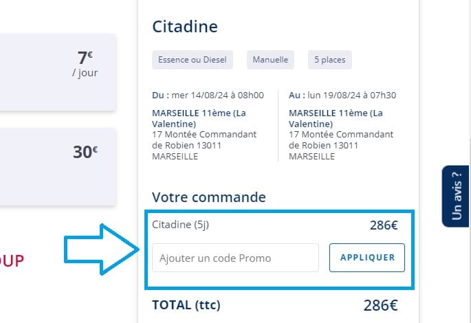 - Dans votre panier, vous trouverez une case intitulée "Ajouter un code promo". Entrez votre code de réduction Rent A Car dans cet espace. Après avoir saisi votre code avantage, cliquez sur "Appliquer" pour que la réduction soit activée.