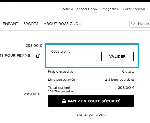 • Collez votre code promo : rendez-vous dans votre panier et trouvez le champ “Code promo”. Entrez votre code promo Rossignol pour appliquer immédiatement la réduction sur vos articles.