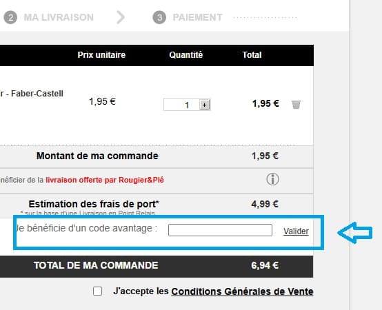 - Dans la section dédiée aux codes promo, saisissez votre bon de réduction Rougier & Plé et cliquez sur “Valider”.