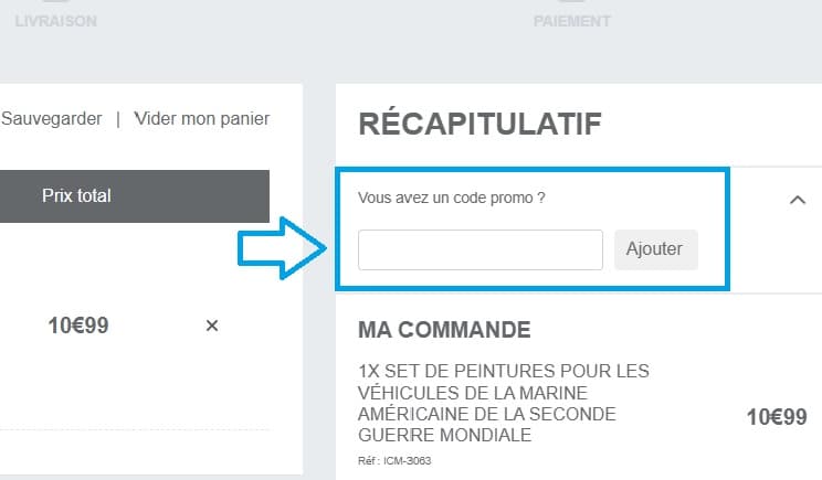 - À cette étape, vous verrez un champ nommé “Vous avez un code promo ?”. Renseignez-y votre bon de réduction Rue des Maquettes, puis validez pour appliquer la remise.