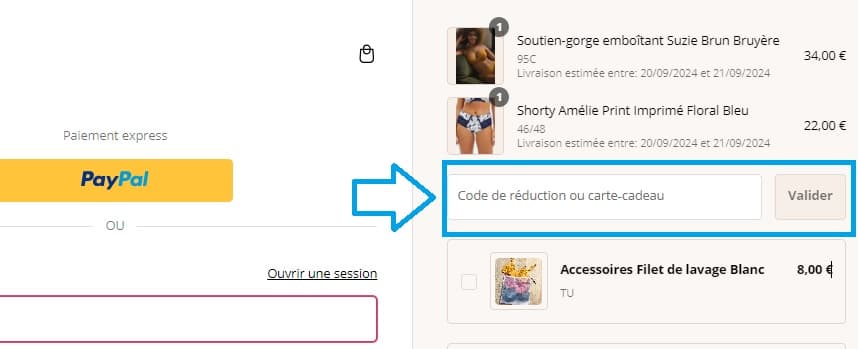 - Après, cherchez la case intitulée “Code de réduction ou carte-cadeau” sur la page de paiement. Collez-y votre code promo Sans Complexe Lingerie et vérifiez qu'il est correctement appliqué avant de procéder au paiement.