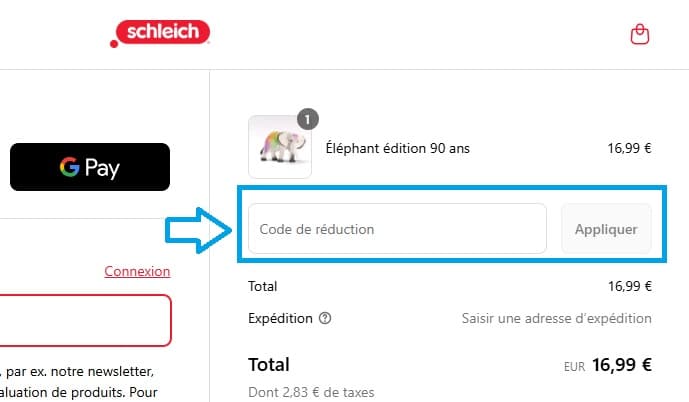 - Puis, mettez votre code promo Schleich dans la case “Code de réduction” et cliquez sur "Appliquer" pour bénéficier de la réduction.