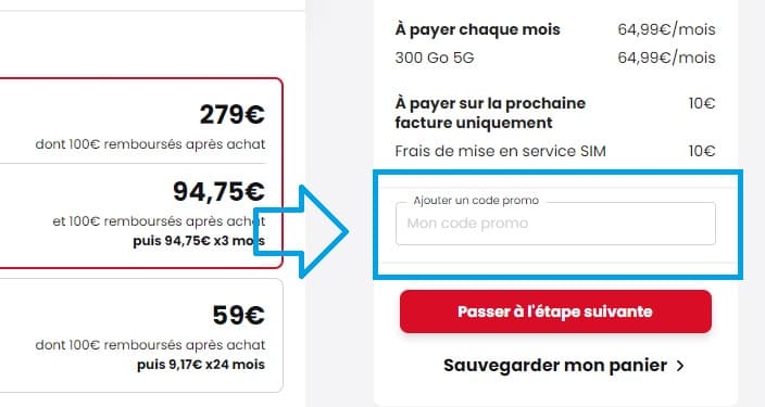 - Avant de valider votre achat, repérez le champ nommé “Ajouter un code promo” et mettez votre code promo SFR dans cet espace et validez-le pour que la remise s’applique automatiquement à votre commande.