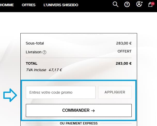 - Puis, repérez le champ “Entrez votre code promo ” et saisissez votre code de réduction Shiseido.