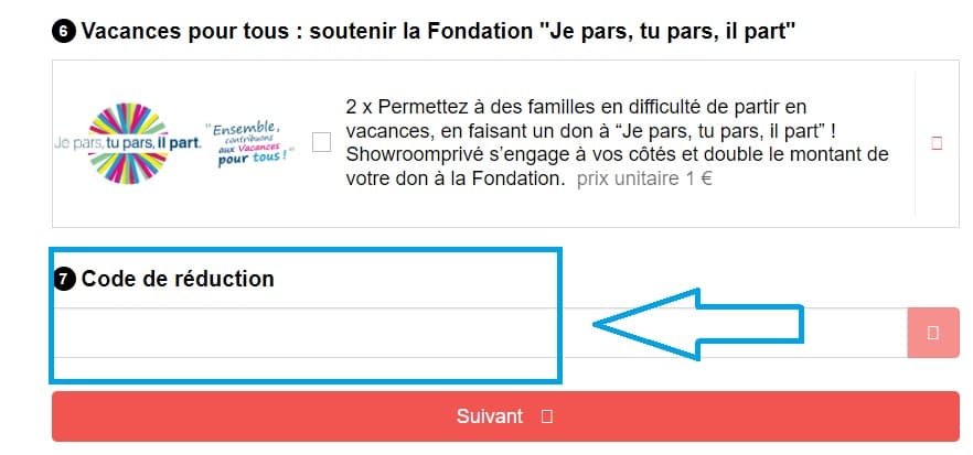 - Entrez votre code de réduction Showroomprivé Voyages dans cette case pour bénéficier de l’avantage associé.