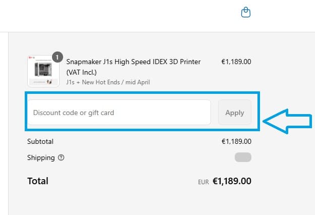 - Repérez le champ prévu pour entrer un code promo, saisissez-y le bon de réduction Snapmaker que vous avez choisi.