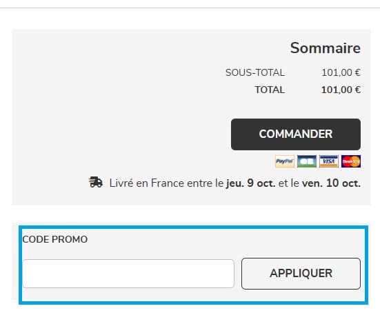 - Entrer le code dans la case dédiée : dans le récapitulatif de commande, repérez l’espace “Code promo”. Collez-y votre code promo Sport is good puis validez-le.