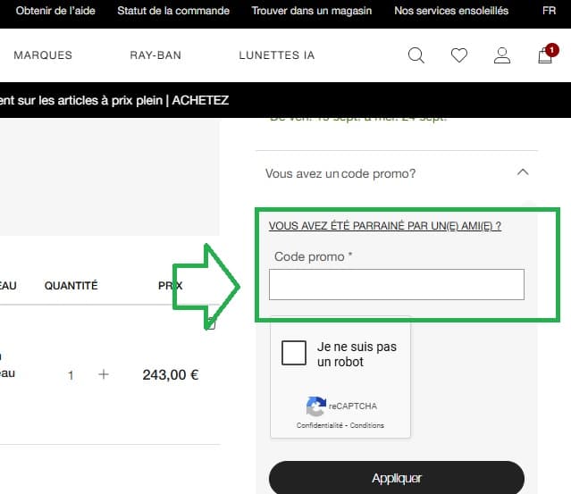 - Avant de finaliser votre commande, repérez le champ “ Vous avez un code promo ? ” et saisissez-y votre code promo Sunglass Hut.
