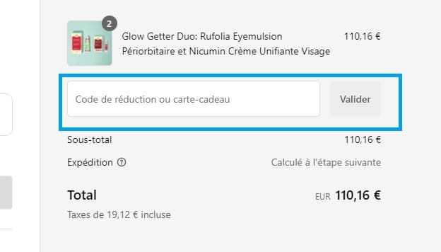 - Lorsque vous êtes sur la page de validation de commande, vous trouverez un champ intitulé “Code de réduction ou carte cadeau” et collez votre code promo The Ayurveda Experience dans cette section.