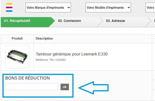 - Il suffit d’y insérer votre code promo Toner Express, puis de cliquer sur le bouton permettant d’activer la réduction immédiate.
