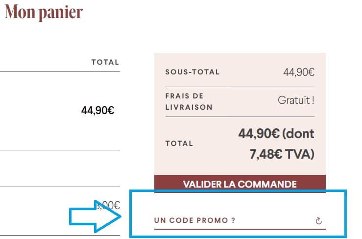 - Sur cette page, repérez le champ "Un code promo ?" et collez votre code de réduction Trois Fois Vin dans cette case et appliquez-le à votre commande.