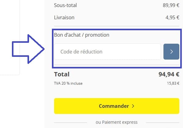 - Avant de passer au paiement, repérez le champ dédié aux codes de réduction, nommé “Bon d’achat / promotion” et saisissez votre code promo Trotec dans cet espace.